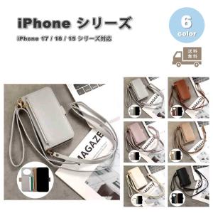 iPhone PUレザー 手帳型 ショルダーストラップ ミラー ケース 全6色 17 / 16 / 15 シリーズ対応 耐衝撃 薄型 軽量 カバー 送料無料