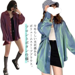 ロングシャツ UV対策 オーバーサイズ 羽織り レディース シャツ 体型カバー 長袖 ドロップスリーブ トレンド 復古 かわいい 光沢感 春 シャツ