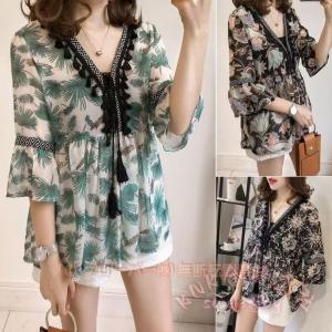 ブラウス レディース 7分袖 花柄 Vネック シフォン KNK(株) 夏 トップス リゾート 着痩せ パフスリーブ 涼しげ カジュアル 着まわし 20代30代40代50代
