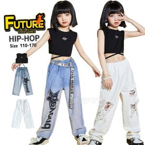 k-pop 衣装 青 白 パンツ デニムパンツ キッズダンス衣装 セットアップ へそ出し トップス 青パンツ 白ズボン ジーパン ダメージ ベスト 黒 袖なし 破れた ヒッ