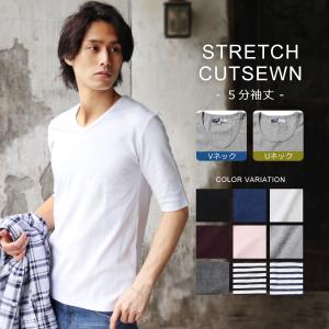 カットソー メンズ 5分袖 ハーフ Tシャツ スパンフライス Uネック Cネック カットソー