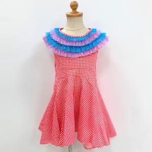 【最終値下げ】fafa チュールフリルカラー ギンガムチェックワンピース 110 ロングフレアスカ―ト ドレス red blue 華やか 子供服 女の子 夏 2541-0003 フェフェ
