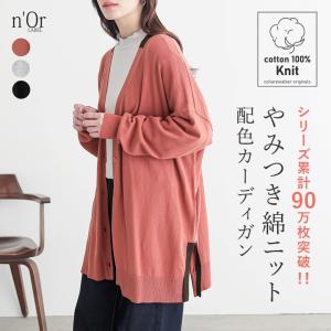 カーディガン レディース ニット トップス 長袖 羽織 ロング丈 Vネック コットン100% 配色 スリット 重ね着 体型カバー「メール便不可」「30」