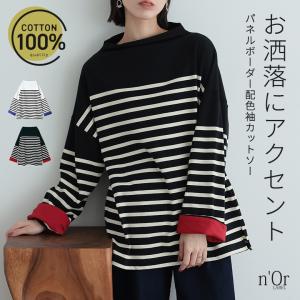 カットソー 長袖 レディース トップス ロンT ボーダー柄 パネルボーダー ボトルネック 配色 綿100% オーバーサイズ 50代 秋 冬 春「メール便可」「10」
