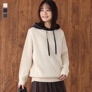 ニット パーカー 長袖 レディース トップス セーター フーディー フード付き プルオーバー 配色 無地 ショート丈 ざっくりニット 秋 冬「メール便不可」「30」