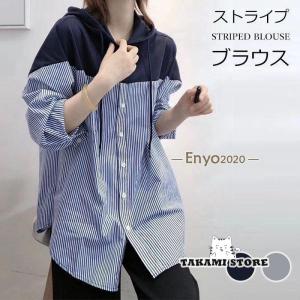 ストライプブラウス レディース シャツ トップス デザイン シャツ 長袖 ストライプ柄 フード 切替え カジュアル