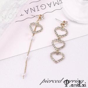 ピアス スタッドピアス アシンメトリー ロングピアス レディース 女性 アクセサリー 揺れる ハート ラインストーン キラキラ お洒落 可愛い キュー