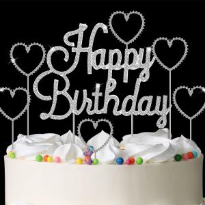 シルバーハッピーバースデーケーキトッパーラインストーンとグリッターハートカップケーキトッパーキラキラ輝くダイヤモンド宝石メタルバースデーケーキデコレー