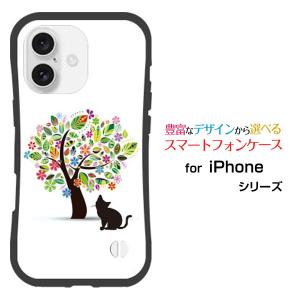スマホケース iPhone 16 Plus 耐衝撃 ハイブリッドケース ストラップホール付 花と猫 花柄 フラワー 木 猫 ねこ ネコ シルエット イラスト かわいい