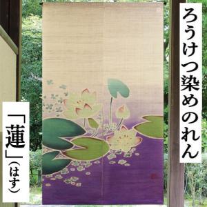 麻のれん 「蓮」 ろうけつ染めのれん 手描きのれん のれん 本麻 万葉舎 大正ロマン ロング丈 インテリア 暖簾 ロウケツ染め 古典 生成り 紫