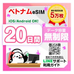 ベトナムeSIM:使用日数:20日間/データ容量:無制限/簡単設定/有効期限90日/最短即日発行/パスポート番号不要/データ通信専用
