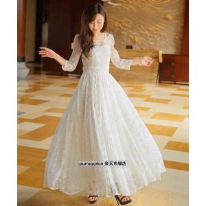 上質 ロングドレス 広がる裾 レースワンピース レディース パーティードレス 総レース 仙女風 ハイウエスト 優雅な マキシ丈 ドレス リゾート 旅行 結婚式 披露