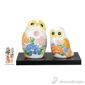 夫婦ふくろう 盛 4号 台・立札付 ( 木札名入れ有料 退職祝い 定年 フクロウ 置物 玄関 風水 小物 九谷焼 結婚 出産 内祝い 引き出物 金婚式 )