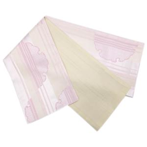 【訳有り 少難あり】 袋帯 お仕立て上がり 全通柄 金糸入り 淡ベージュ地薄ピンクひった雪輪ライン 振袖 成人式 着物 長尺