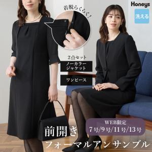 葬儀 通夜 告別式 法事 お盆 法要 弔事 喪服 礼服 洗える 前開き 着やすい セットアップ レディース Honeys ハニーズ ブラックフォーマル(ノーカラー7〜13号)