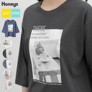 トップス Tシャツ 7分袖Tシャツ カットソー ハニさら フォトプリントTシャツ UVカット 接触冷感 レディース Honeys ハニーズ 7分袖フォトプリントT