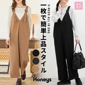 ボトムス オールインワン サロペット イージーケア シワになりにくい Vネック ジョーゼット 無地 ポケット レディース Honeys ハニーズ Vネックオールインワン