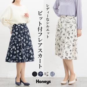 ボトムス スカート ひざ丈 オフィス きれいめ フレアスカート ベルト付き ストレッチ ツイル素材 裏地付き レディース Honeys ハニーズ ベルト付フレアスカート