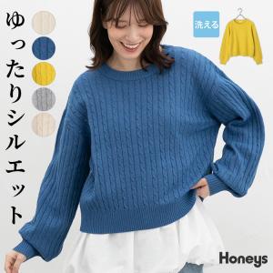 トップス ニット セーター 長袖 ウォッシャブル ケーブル編み 再生ポリエステル クルーネック ボリューム袖 レディース Honeys ハニーズ ケーブル編ニット