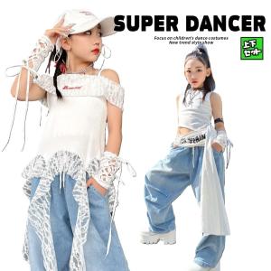 ヒップホップ ダンス衣装 ガールズ K-POP 韓国 白 デニム キッズダンス衣装 セットアップ 派手 トップス パンツ ダンスウェア 子供ダンス服