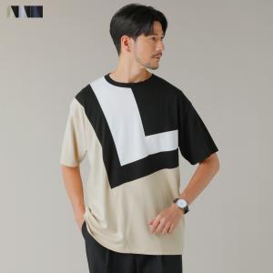Tシャツ カットソー メンズ 夏 夏服 クルーネック 半袖 5分袖 切替 切り替え 配色 オーバーサイズ ベージュ ブラック グレー ネイビー ホワイト M L