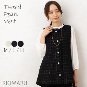 ベスト レディース 秋冬 アウター 春 前開き (M〜LL)ツイード チェック フリンジ 使い 大 パール 調 ベスト(エコ包装)(jk)(dm)