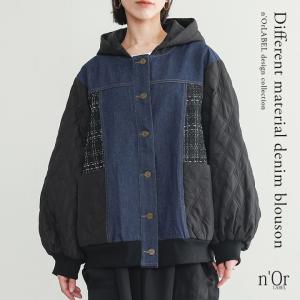 ブルゾン レディース アウター 長袖 フード付き ジャケット 羽織 デニム ツイード 中綿 キルト 異素材 ぽわん袖 50代 秋 冬「送料無料」「メール便不可」「30」