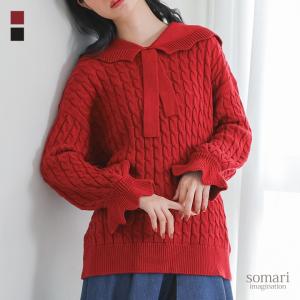 ニット 長袖 レディース トップス セーター セーラーカラー ケーブル編み ぽわん袖 スカラップ 秋 冬「メール便不可」「40」