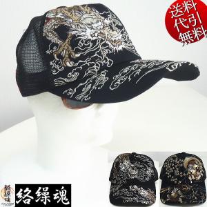 夏新作 春夏秋冬物 絡繰魂/カラクリ魂/からくり魂 双龍 雲 ロゴ 総刺繍 サイズ調整可 サイドバック メッシュ メンズ 和柄 キャップCAP 黒ブラック:F 252854
