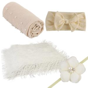 Color:ホワイト 4点 Sweet Plus 撮影用 ブランケット 赤ちゃん 新生児 写真 マット 毛布 ヘアバンド おくるみ カチューシャ ベビーシーツ ニューボーンフォト (