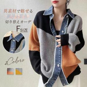 ニットカーディガン カーディガン デニム 切り替え 羽織り アウター バイカラー カーデ ショート丈 カーディガン コート レディース アウター あったか とろみ