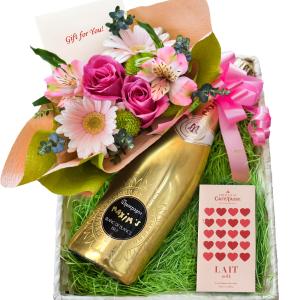 【成人の日】シャンパン チョコレート スイーツセット 「マキシム・ド・パリ 」シャンパーニュ 生花 ピンク バラ ガーベラ チョコレート ミルク 送料無料