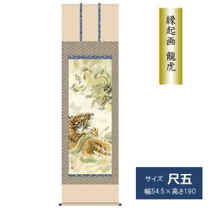 掛け軸 掛軸 縁起画 慶事飾り 龍虎 尺五 長江桂舟 正絹緞子 最高級筋廻仕様 床の間 和室 KZ2D3-066 桐箱入り