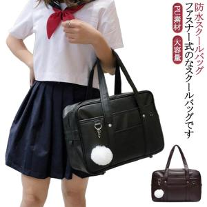 防水スクールバッグ PU素材 バッグ スクバ ポンペンダント付き 通学用 学生鞄 黒 ブラック ブラウン 塾用 おしゃれ かわいい シンプル ベルトつ