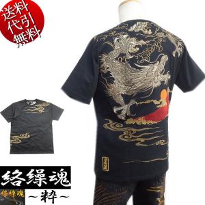 新作 ビッグ有 絡繰魂/カラクリ魂/からくり魂 粋 赤富士龍刺繍 太陽 総刺繍 天竺 クルーネック 和柄カジュアル TEE 半袖Tシャツ 黒 M/L/XL(LL)/XXL(3L) 252043