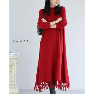 Sから2L対応 ブロックチェック浮かぶ裾フリンジニットミディアムワンピース
