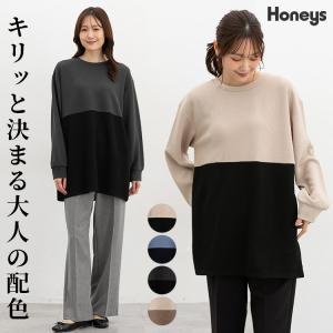 トップス カットソー 長袖 チュニック 配色 ドロップショルダー ストレッチ サカリバ素材 レーヨン混 ポケット レディース Honeys ハニーズ 配色チュニック