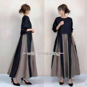 ワンピース 秋服 レディース きれいめ バイカラー 切り替え aラインワンピース フレアワンピース 長袖 丸首 秋冬 上品 大人エレガント可愛い お呼ばれワンピース