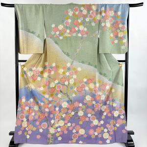 訪問着 身丈170cm 裄丈69.5cm L 袷 松井青々 落款あり 桜 富士山 金糸 金銀彩 灰緑 正絹 逸品 中古