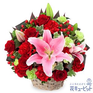 【還暦祝い・長寿祝い】花キューピット 花 ギフト 誕生日 お祝い 記念日 ユリと赤色のバスケットアレンジメント