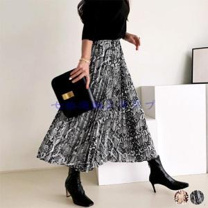 ロングスカート 柄 秋冬 スカート ロング レディース パイソン柄 ひょう柄 プリーツ 黒 グレー 蛇柄 韓国 メール便