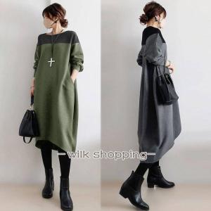 コクーンワンピース 春秋 長袖ワンピース50代 バイカラーワンピース 前後差 タック入れ ワンピース 丸首 40代50代60代 オフィス 通勤 ゆったり 仕事 可愛い