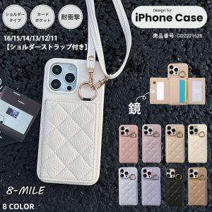 【ショルダーストラップ付き】iPhone 16 ケース キルティング ケース ミラー付き iPHONE15 ショルダー タイプ 背面カバー おしゃれ カード収納 韓国 化粧直し