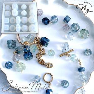 シリコン 型 モールド 穴開き ビーズ 9種×2個 計18個 ■ シリコンモールド 四角 丸 鉱石 宝石 キューブ つるつる キラキラ ツヤ キーホルダー パーツ 手作り ■