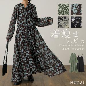 ワンピース ロング 2点セット インナー付き シフォン ロングワンピ ペチコート キャミソール 長袖 透け 花柄 羽織 レディース