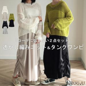 ワンピース レディース サマーニット 2点セット トップス レイヤード 透かし編み ニット ロング セットアップ ノースリーブ