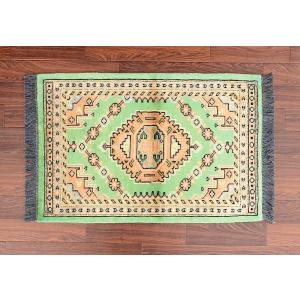 ≪訳あり・在庫処分≫アフガニスタン絨毯 ウール100% 手織り絨毯 玄関マット 65×97 cm グリーン ダブルノット