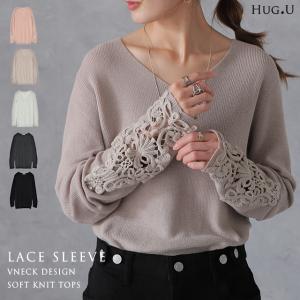 ニット レディース レース トップス 袖レース セーター Vネックリブ 薄手 黒 ピンク