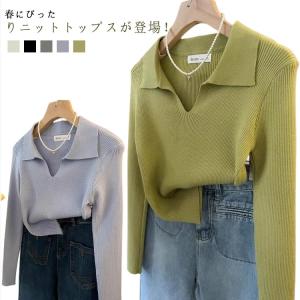 ニット Vネック 春 レディース 長袖 リブ ニットソー シンプル スリム フィット ポロニット 通勤 細身 きれいめ カジュアル オフィス 韓国ファ
