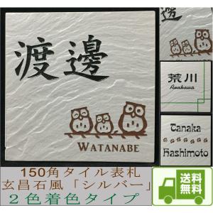 招福デザイン表札 フクロウ ヤモリ シーサー 四神 雀と竹 ツバメ 二世帯もOK 150角玄昌石風表札「シルバー」2色着色タイプ タイル表札 追加マグネット可